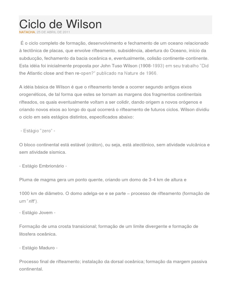 Resfriamento lento da crosta ocenica recm-formada, que junto com o peso dos sedimentos afunda a crosta. A cunha de sedimentos se expande desde a plataforma at a plancie abissal, variando de espessura gradualmente; variaes composicionais dependem das rochas-fonte erodidas. - Estgio Declinante Incio com quebra da crosta ocenica recm-formada e subduco, por causa da sua densidade; aquecimento gradual da litosfera em subduco. Desidratao ao longo da placa; gerao de magmas por fuso da cunha do manto sobrejacente. - Estgio Terminal Inmeras seqncias de convergncia e coliso entre duas placas continentais ou entre uma placa continental e arcos de ilhas, gerando cadeias de montanhas. - Estgio Reliquiar Consumo total da litosfera ocenica, que resulta em uma intensa atividade tectnica Modernamente o termo vem sendo proposto em substituio ao termo Ciclo das rochas, por conseguir dar uma viso mais dinmica da histria e transformaes da crosta terrestre e suas rochas constituintes. * Para saber mais: Ver THE WILSON CYCLE: RIFTING AND THE DEVELOPMENT OF OCEAN BASINS nosite Department of Geology University of Leicester / UK Fontes: http://www.dicionario.pro.br/dicionario/index.php/Ciclo_de_Wilson http://vsites.unb.br/ig/glossario/verbete/ciclo_de_wilson.htm http://www.oceanografia.ufba.br/ftp/Introducao_Oceanografia/geologia_2.pdf http://www.igc.usp.br/fileadmin/disciplinasweb/d84/Ciclo%20de%20Wilson_Aula%201.pdf