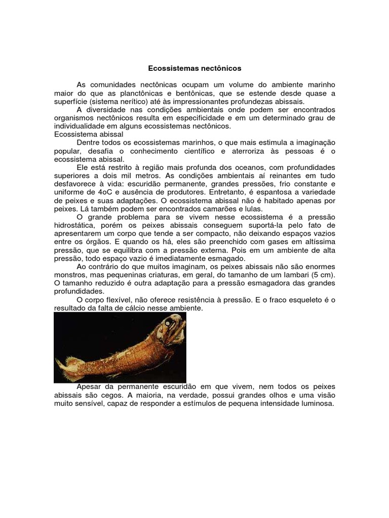 quase a superfcie (sistema nertico) at s impressionantes profundezas abissais. A diversidade nas condies ambientais onde podem ser encontrados organismos nectnicos resulta em especificidade e em um determinado grau de individualidade em alguns ecossistemas nectnicos. Ecossistema abissal Dentre todos os ecossistemas marinhos, o que mais estimula a imaginao popular, desafia o conhecimento cientfico e aterroriza s pessoas o ecossistema abissal. Ele est restrito regio mais profunda dos oceanos, com profundidades superiores a dois mil metros. As condies ambientais a reinantes em tudo desfavorece vida: escurido permanente, grandes presses, frio constante e uniforme de 4oC e ausncia de produtores. Entretanto, espantosa a variedade de peixes e suas adaptaes. O ecossistema abissal no habitado apenas por peixes. L tambm podem ser encontrados camares e lulas. O grande problema para se vivem nesse ecossistema a presso hidrosttica, porm os peixes abissais conseguem suport-la pelo fato de apresentarem um corpo que tende a ser compacto, no deixando espaos vazios entre os rgos. E quando os h, eles so preenchido com gases em altssima presso, que se equilibra com a presso externa. Pois em um ambiente de alta presso, todo espao vazio imediatamente esmagado. Ao contrrio do que muitos imaginam, os peixes abissais no so enormes monstros, mas pequeninas criaturas, em geral, do tamanho de um lambari (5 cm). O tamanho reduzido outra adaptao para a presso esmagadora das grandes profundidades. O corpo flexvel, no oferece resistncia presso. E o fraco esqueleto o resultado da falta de clcio nesse ambiente.