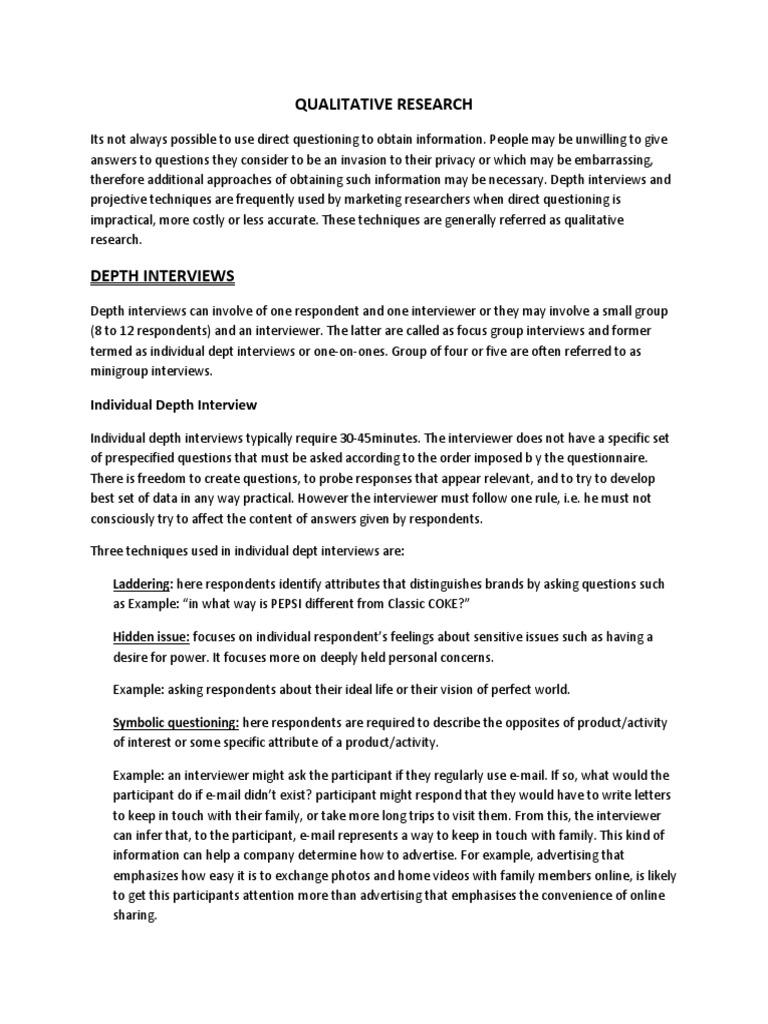 Individual depth interviews typically require 30-45minutes. The interviewer does not have a specific set of prespecified questions that must be asked according to the order imposed b y the questionnaire. There is freedom to create questions, to probe responses that appear relevant, and to try to develop best set of data in any way practical. However the interviewer must follow one rule, i.e. he must not consciously try to affect the content of answers given by respondents. Three techniques used in individual dept interviews are: Laddering: here respondents identify attributes that distinguishes brands by asking questions such as Example: in what way is PEPSI different from Classic COKE? Hidden issue: focuses on individual respondents feelings about sensitive issues such as having a desire for power. It focuses more on deeply held personal concerns. Example: asking respondents about their ideal life or their vision of perfect world. Symbolic questioning: here respondents are required to describe the opposites of product/activity of interest or some specific attribute of a product/activity. Example: an interviewer might ask the participant if they regularly use e-mail. If so, what would the participant do if e-mail didnt exist? participant might respond that they would have to write letters to keep in touch with their family, or take more long trips to visit them. From this, the interviewer can infer that, to the participant, e-mail represents a way to keep in touch with family. This kind of information can help a company determine how to advertise. For example, advertising that emphasizes how easy it is to exchange photos and home videos with family members online, is likely to get this participants attention more than advertising that emphasises the convenience of online sharing.