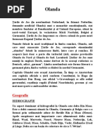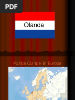 Olanda, oficial rile de Jos este o monarhie constituional, stat membru fondator al Beneluxului i al Uniunii Europene, situat n nord-vestul Europei n vecintatea Mrii Nordului, Belgiei iGermaniei, incluznd alturi de Regatul rilor de Jos i cteva colonii. Numele colocvial de Olanda, sub care mai sunt cunoscute rile de Jos, acoper ns doar o parte din teritoriul rii, anume cele douasprezece provincii din Olanda de Nord i Olanda de Sud si anume : Frizia,Groningen, Drenthe, Overijssel, Flevoland, Gelderland, Utrecht, Olanda de Nord,Olanda de Sud,Zeelanda,Brabatul de Nord, Limburg . Locuitorii rilor de Jos sunt numii n englez Dutch, nume derivat de la aceeai rdcin ca german deutsch, adic "germani". Limba neerlandez este forma literar a germanei plate, limba vorbit ca dialect n nordul Germaniei. Independenta 23 ianuarie 1579 (provinciile din nord a Tarilor de jos hotarasc ca uniunea Utrecht sa se separe se Spania; pe 26 iulie 1581 si-au declarat oficial independenta cu un Act de Abjurare; Spania lea recunoscut independenta la 30 ianuarie, odata cu Pacea de la Westphalia). Este membr NATO i UE, BIRD, IDA, IFAD, IFC, ILO, IMO, MIGA, NATO,OSCE, UNESCO, etc. Imnul - Wilhelmus van Nassouwe. Moneda naional - Euro Capitala rilor de Jos este Amsterdam. La Haga se afl sediul guvernului, reedina regal, precum i cea mai mare parte a ambasadelor. Suprafa - 41.543 km Populaie Olanda are o populaie estimat la 16 491 852 mil loc. (8 martie 2009). Este a 11a ar ca populaie din Europa i a 68-a n lume. ntre 1900 i 1950 populaia aproape s-a dublat, de la 5,1 mil loc la 11 mil. loc. Din 1950 populaia a crescut de la 10 mil loc la 15,9 mil loc. Sperana de via este ridicat n Olanda - 82 de ani pentru fetele nou-nscute i 77 de ani pentru bieii nou-nscui. Impartire etnica - Olandezi 80,7%, Europeni 5%, Indonezieni 2,4%, Turci 2,2%, Surinamezi 2%, Marocani 2%, Caraibieni 0,8%, alte etnii 4,8%. Impartire religioasa - Romano-catolici 30%, Reformani olandezi 11%, Calviniti 6%, Protestani 3%, Musulmani 5,8%, alte religii 44,2%. Clima - este temperat marin, adic vara rcoroas i iarna blnd. Uneori iarna poate fi foarte frig, uscat i cu soare cu periode ploioase i de cea. n timpul verii, soarele nu este garantat, dar temperatura calda e posibil.