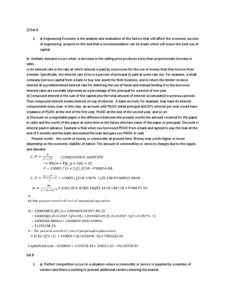 b) Inelastic demand occurs when a decrease in the selling price produces a less than proportionate increase in sales. c) An interest rate is the rate at which interest is paid by a borrower for the use of money that they borrow from a lender. Specifically, the interest rate (I/m) is a percent of principal (I) paid at some rate (m). For example, a small company borrows capital from a bank to buy new assets for their business, and in return the lender receives interest at a predetermined interest rate for deferring the use of funds and instead lending it to the borrower. Interest rates are normally expressed as a percentage of the principal for a period of one year d) Compound interest is the sum of the capital plus the total amount of interest accumulated in previous periods. Thus compound interest means interest on top of interest. A bank account, for example, may have its interest compounded every year: in this case, an account with P1000 initial principal and 20% interest per year would have a balance of P1200 at the end of the first year, P1440 at the end of the second year, and so on. e) Discount on a negotiable paper is the difference between the present worth( the amount received for the paper in cash) and the worth of the paper at some time in the future (the face value of the paper or principal). Discount is interest paid in advance. Example is that when you borrowed P5000 from a bank and agreed to pay the loan at the end of 9 months and the bank discounted the loan and gave you P4000 in cash. Present worth - the worth of money or commodity at present time. Money may worth higher or lower depending on the economic stability of nation. The amount of commodities or services changes due to the supply and demand.
