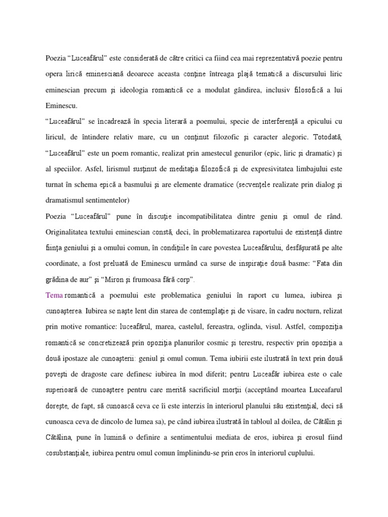 Luceafrul este un poem romantic, realizat prin amestecul genurilor (epic, liric i dramatic) i