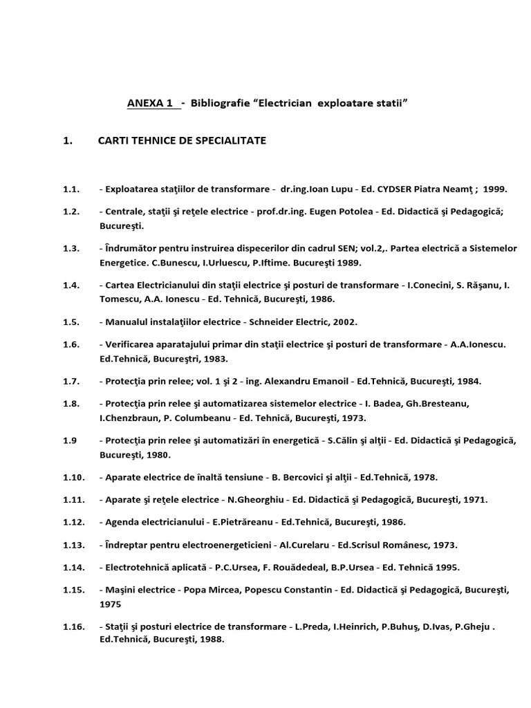 ANEXA 1 - Bibliografie Electrician exploatare statii