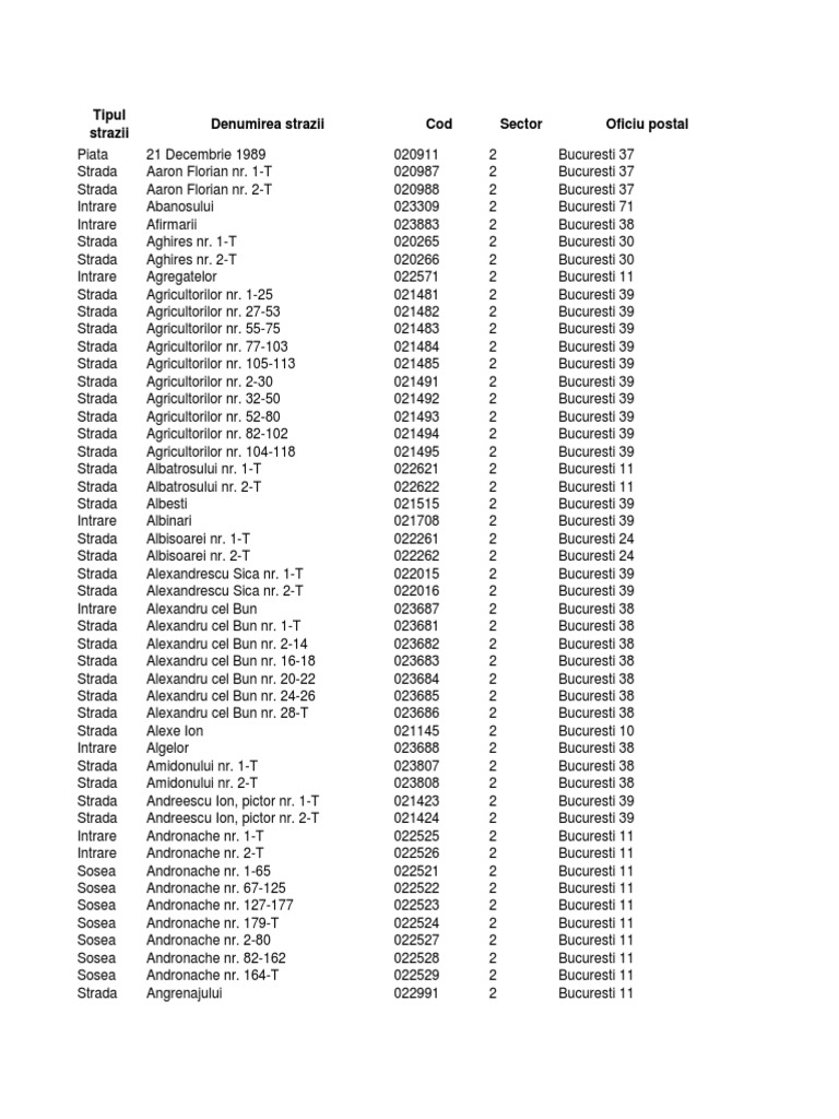 Coduri Postale Bucuresti - Sector 2