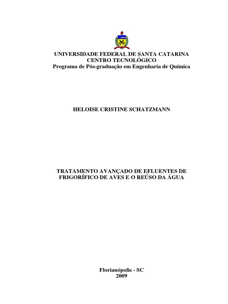 Tratamento Avançado de Efluentes de Frigorífico de Aves e o Reúso da Água. Heloise Cristine Schatzmann – Florianópolis, 2009. xiii, 108f.