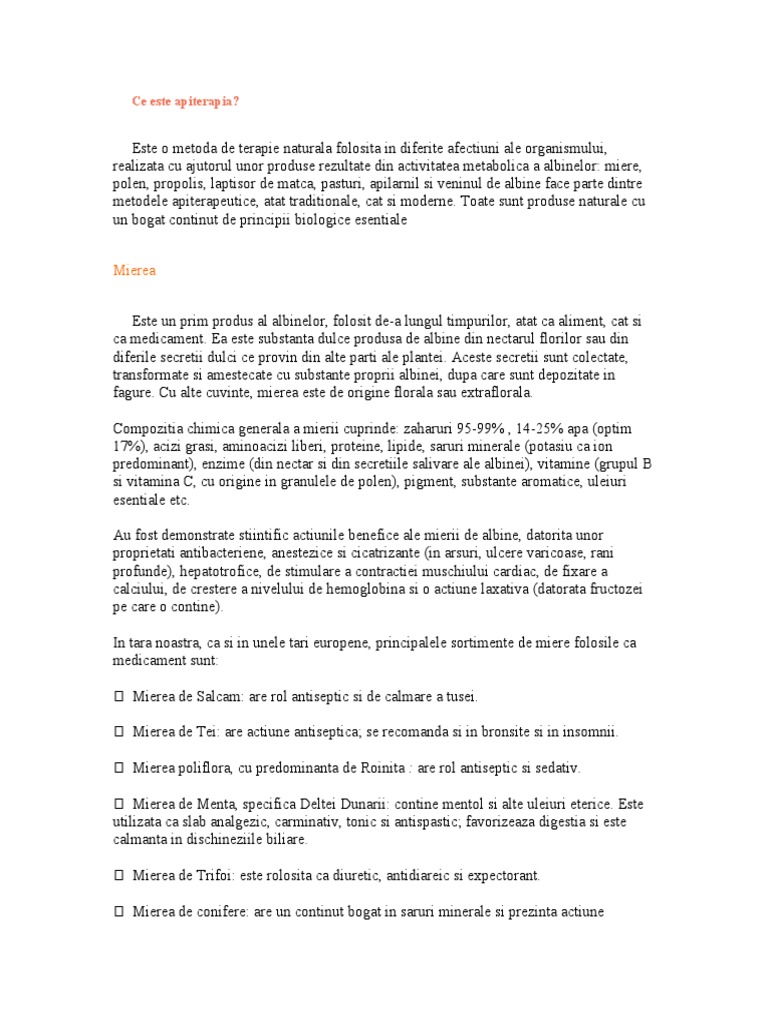 propolisul, polenul, pastura, laptisorul de matca) si produse apicole derivate