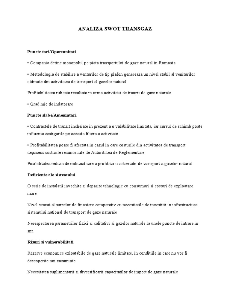 Posibilitatea redusa de imbunatatire a profitatii ii activitatii de transport a gazelor natural.