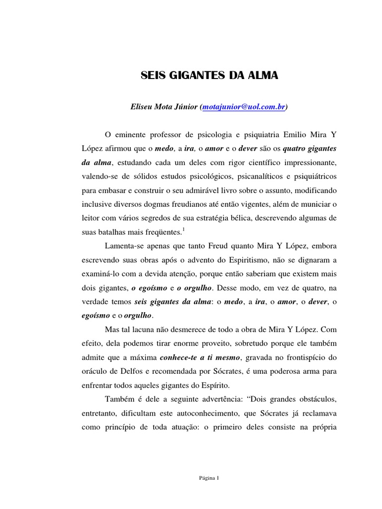 Lamenta-se apenas que tanto Freud quanto Mira Y Lpez, embora escrevendo suas obras aps o advento do Espiritismo, no se dignaram a examin-lo com a devida ateno, porque ento saberiam que existem mais dois gigantes, o egosmo e o orgulho. Desse modo, em vez de quatro, na verdade temos seis gigantes da alma: o medo, a ira, o amor, o dever, o egosmo e o orgulho. Mas tal lacuna no desmerece de todo a obra de Mira Y Lpez. Com efeito, dela podemos tirar enorme proveito, sobretudo porque ele tambm admite que a mxima conhece-te a ti mesmo, gravada no frontispcio do orculo de Delfos e recomendada por Scrates, uma poderosa arma para enfrentar todos aqueles gigantes do Esprito. Tambm dele a seguinte advertncia: Dois grandes obstculos, entretanto, dificultam este autoconhecimento, que Scrates j reclamava como princpio de toda atuao: o primeiro deles consiste na prpria Pgina 2 proximidade, que dificulta enormemente todo intento introspectivo (do mesmo modo que quanto mais aproximamos um objeto de nossa vista pior o vemos); o segundo deriva das modificaes constantes de nosso tonus vital refletidas em nosso humor e em nossa autoconfiana que nos levam a tingir sempre o autojuzo estimativo, dando-lhe uma exagerada colorao rsea ou um injustificado tom de obscuro pessimismo. De fato, o homem, depois de considerar-se o Rei da Criao, passa, quase que sem meio- termo, a julgar-se simples barro; umas vezes se considera como esprito prximo de Deus e outras como mquina de reflexos. 2