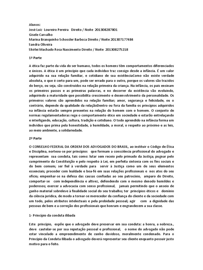 Princpio da Conduta Ilibada o advogado dever representar seu cliente enquanto possuir justo