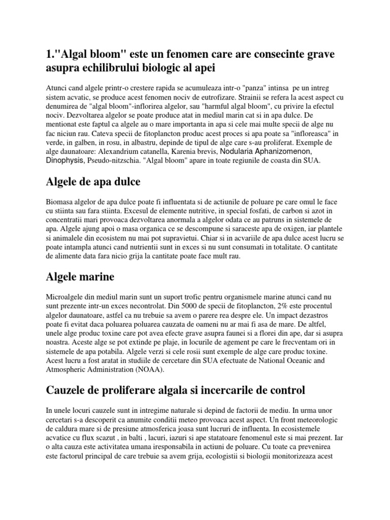 nociv. Dezvoltarea algelor se poate produce atat in mediul marin cat si in apa dulce. De