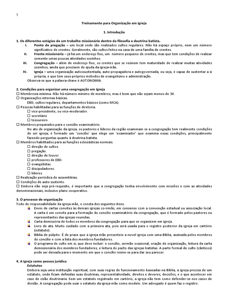 Membresia mínima. Não há número mínimo de membros, mas é bom que não sejam menos de 30. Organizações internas básicas. EBD, cultos regulares, departamentos básicos (como MCA). Pessoas habilitadas para as funções de diretoria. vice-presidente, ou vice-moderador. secretário tesoureiro Membros preparados para o concílio examinatório. No ato de organização da igreja, os pastores e líderes da região examinam se a congregação tem realmente condições de ser igreja; é formado um ‘concílio’ que elege um ‘examinador’ que examina essas condições, principalmente fazendo perguntas quanto à doutrina batista. Membros habilitados para as funções eclesiásticas normais. direção de cultos. pregação. direção de louvor. professores de EBD. evangelistas. discipuladores. líderes. Realização periódica de assembléias. Condições de auto-sustento. Embora não seja pré-requisito, é importante que a congregação tenha envolvimento com missões e com as atividades denominacionais, inclusive plano cooperativo.