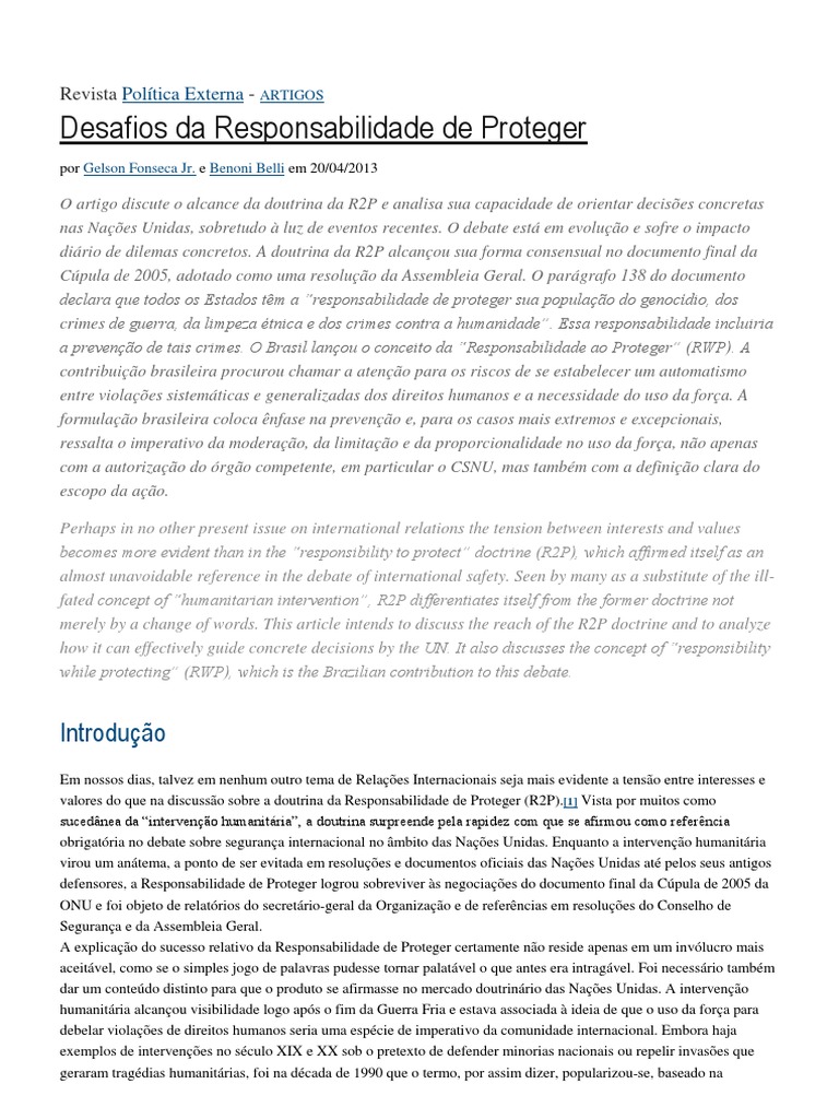 valores do que na discusso sobre a doutrina da Responsabilidade de Proteger (R2P).[1] Vista por muitos como