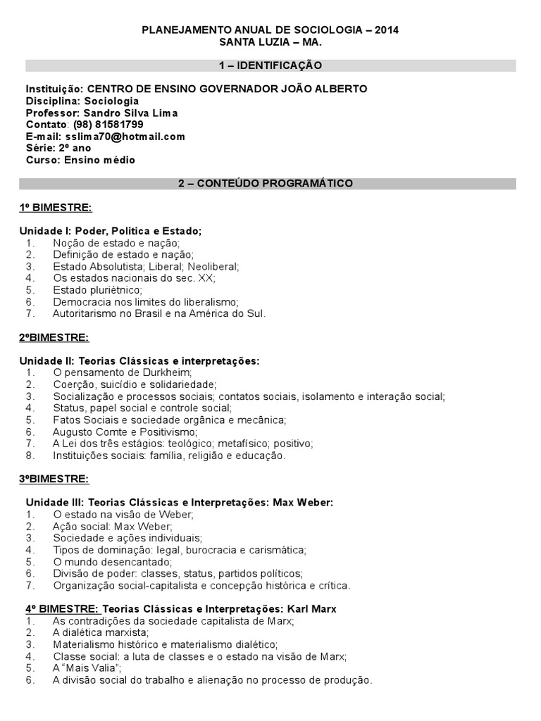 PLANEJAMENTO ANUAL DE SOCIOLOGIA 2014