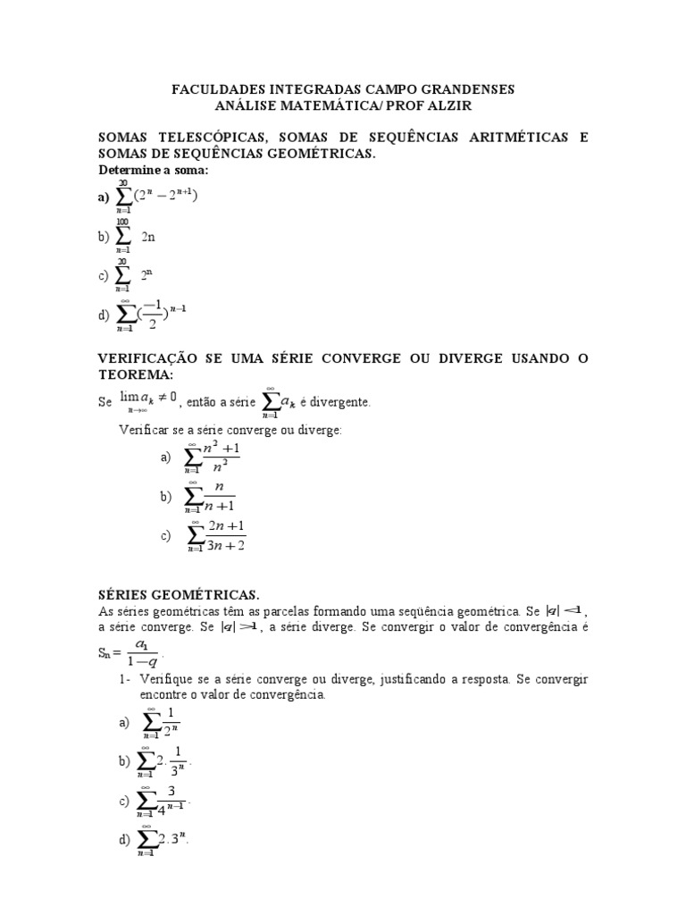 1- Verifique se a série converge ou diverge, justificando a resposta. Se convergir