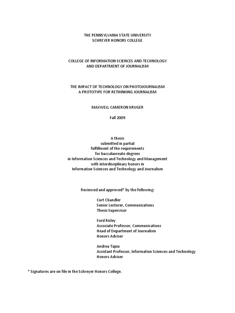 Honors: Information Sciences and Technology and Journalism Thesis Title: The Impact Of Technology On Photojournalism Thesis Supervisor: Curt Chandler