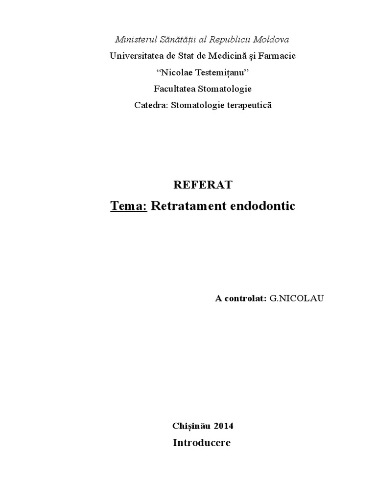 :rocesul de retratare a canalelor radiculare cu o*turarea ulterioar a acestora rm&ne o