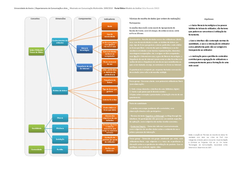 Conceitos  Dimensões  Componentes  Indicadores  Técnicas de recolha de dados (por ordem de realização)  Hipóteses: