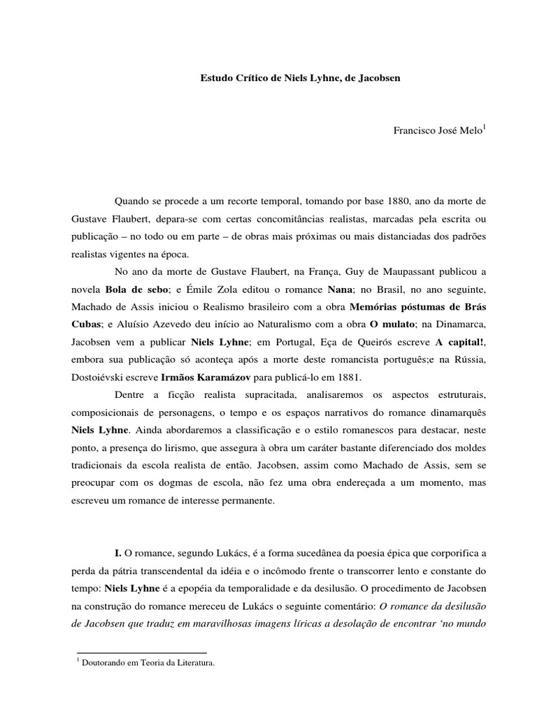 I. O romance, segundo Lukács, é a forma sucedânea da poesia épica que corporifica a perda da pátria transcendental da idéia e o incômodo frente o transcorrer lento e constante do tempo: Niels Lyhne é a epopéia da temporalidade e da desilusão. O procedimento de Jacobsen na construção do romance mereceu de Lukács o seguinte comentário: O romance da desilusão de Jacobsen que traduz em maravilhosas imagens líricas a desolação de encontrar ‘no mundo