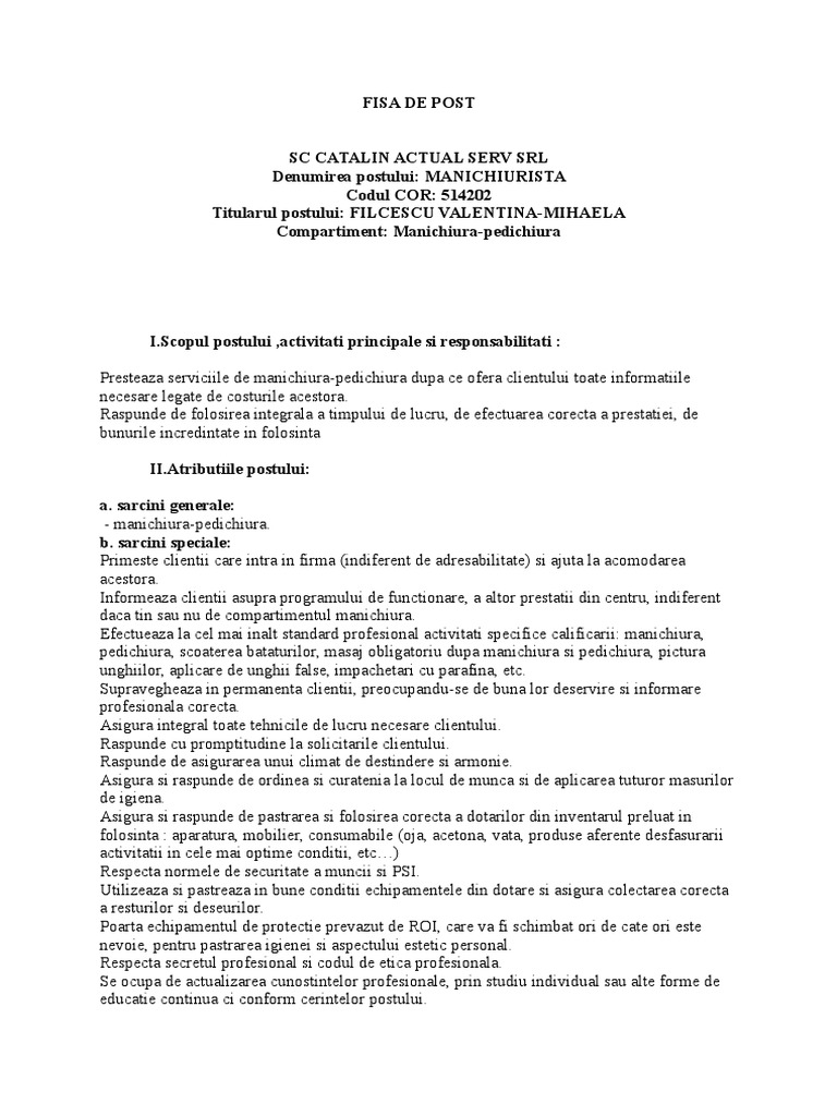 Denumirea postului: MANICHIURISTA