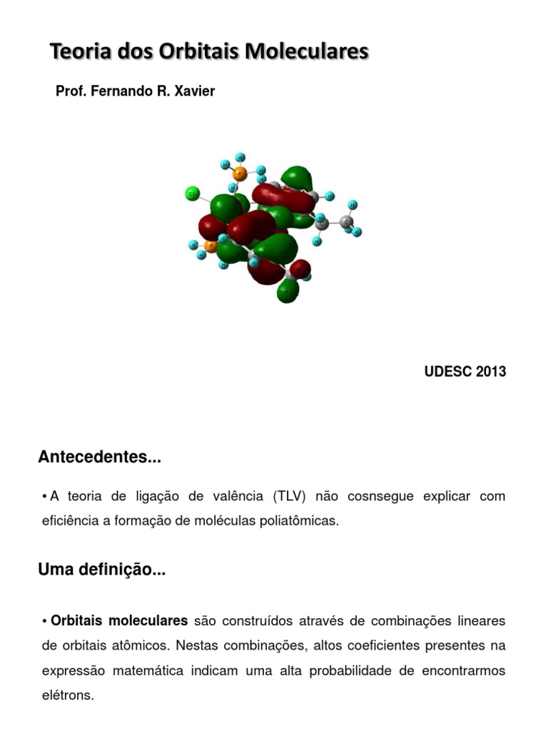 • Orbitais moleculares são construídos através de combinações lineares de orbitais atômicos. Nestas combinações, altos coeficientes presentes na expressão matemática indicam uma alta probabilidade de encontrarmos elétrons.