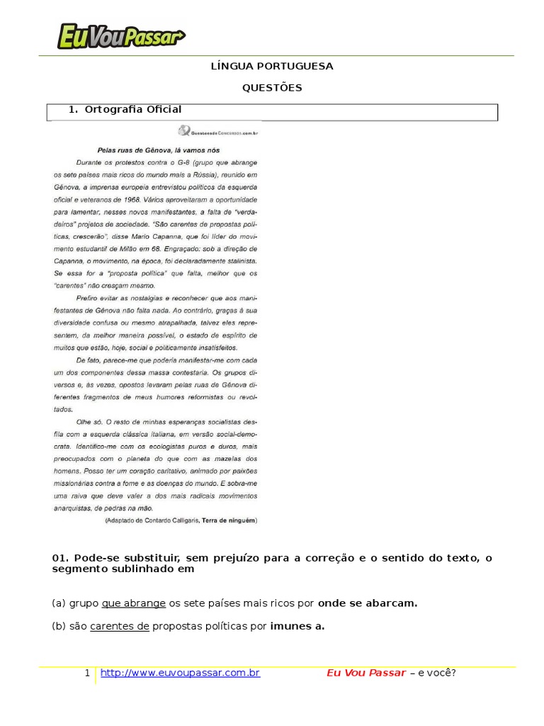 01. Pode-se substituir, sem prejuzo para a correo e o sentido do texto, o
