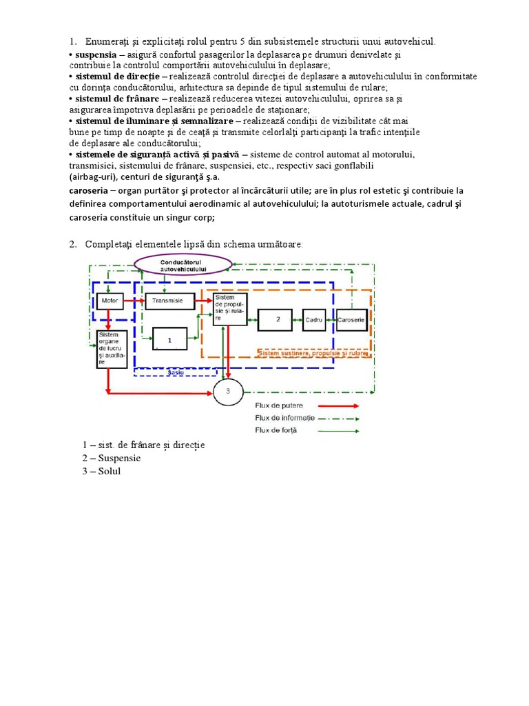 1. Enumerai i explicitai rolul pentru 5 din subsistemele structurii unui autovehicul.