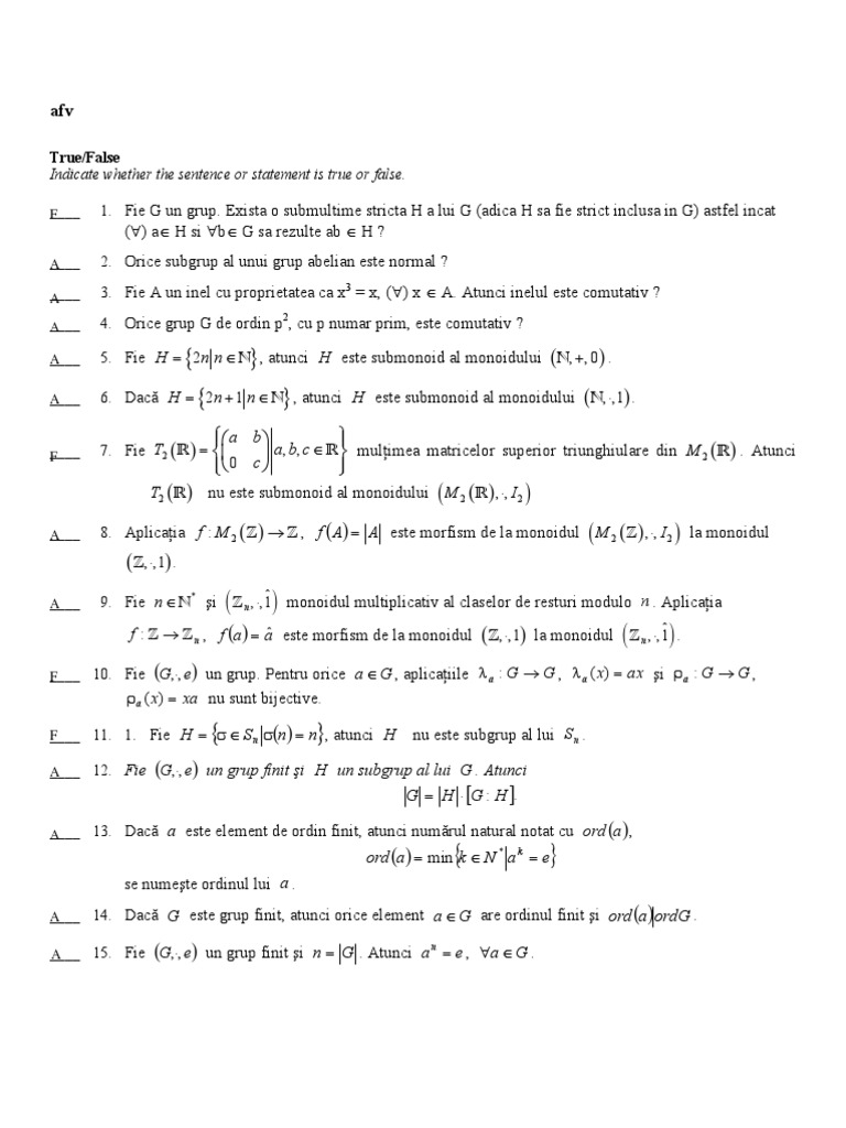 ____ 27. Dacă n ≥ 5 , atunci grupul altern An este simplu.