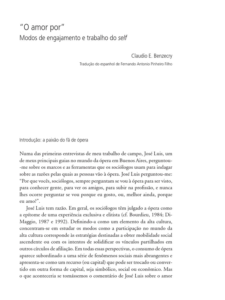 Os sociólogos têm abordado o modo como a participação no mundo da alta cultura relaciona-se com estratégias de ascensão social ou com esforços para solidificar ligações entre os que partilham círculos de afiliação diversos. Nessa perspectiva, o consumo de alta cultura subordina-se a séries mais abrangentes de fenômenos sociais e apresenta-se como recurso a ser trocado ou convertido num diferente tipo de capital – seja simbólico, social ou econômico. Neste artigo, baseado em pesquisa intensiva de campo e de arquivo a respeito dos fanáticos por ópera em Buenos Aires, ao invés de atentar para a relação entre afiliação social e inclinações estéticas, visei as práticas culturais como formas de afiliação social em si mesmas. Tomando a metáfora do “amor por” literalmente, usei-a como suporte para produzir uma tipologia das práticas de ligação, explicando como cada um dos tipos pode ser atribuído a um modo específico de trabalho sobre o self produzido a partir do “amor por” algo. Palavras-chave: Ligação social; Capital cultural; Inclinações estéticas; Formas sociais; Alta cultura.