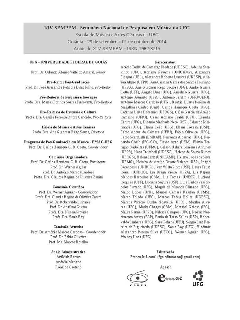 Maura Penna (UFPB), Nilcia Campos (UFG), Noemi Nascimento Ansay (FAP), Paulo de Tarso Salles (USP), Robervaldo Linhares (UFG), Sara Cohen (UFRJ), Srgio Luiz Ferreira de Figueiredo (UDESC), Sonia Ray (UFG), Vladimir