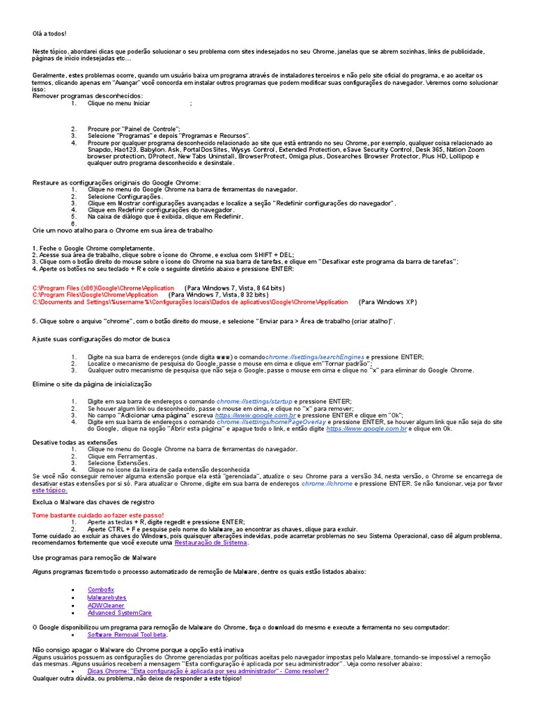 Neste tpico, abordarei dicas que podero solucionar o seu problema com sites indesejados no seu Chrome, janelas que se abrem sozinhas, links de publicidade,