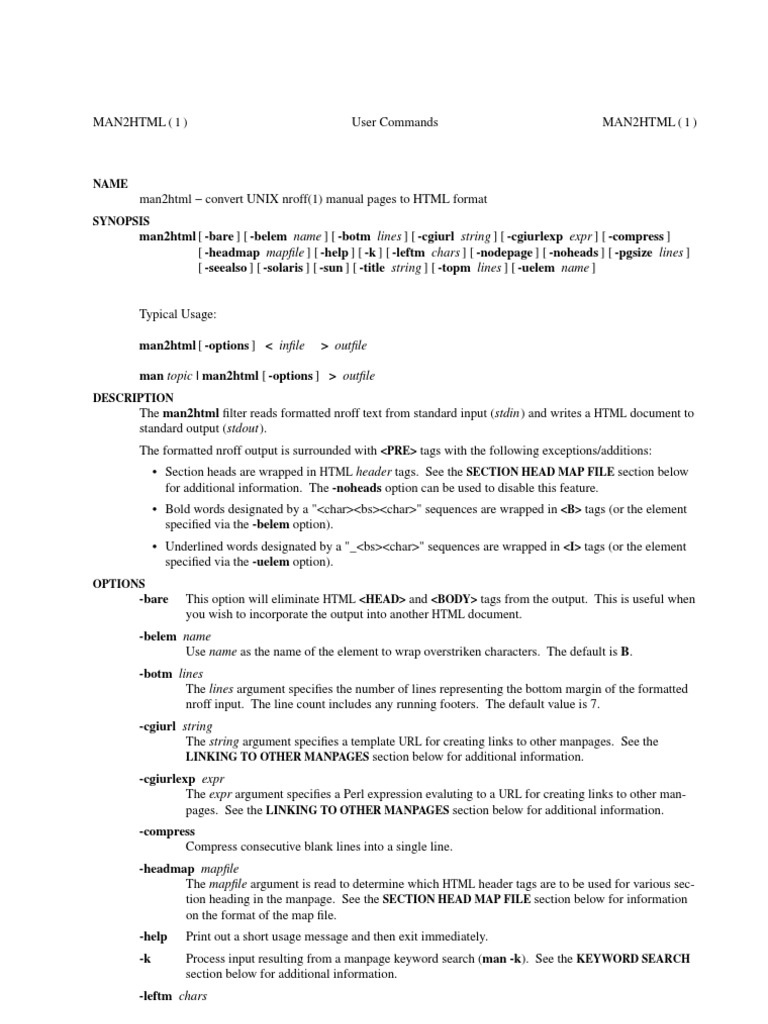 man2html [ -bare ] [ -belem name ] [ -botm lines ] [ -cgiurl string ] [ -cgiurlexp expr ] [ -compress ]