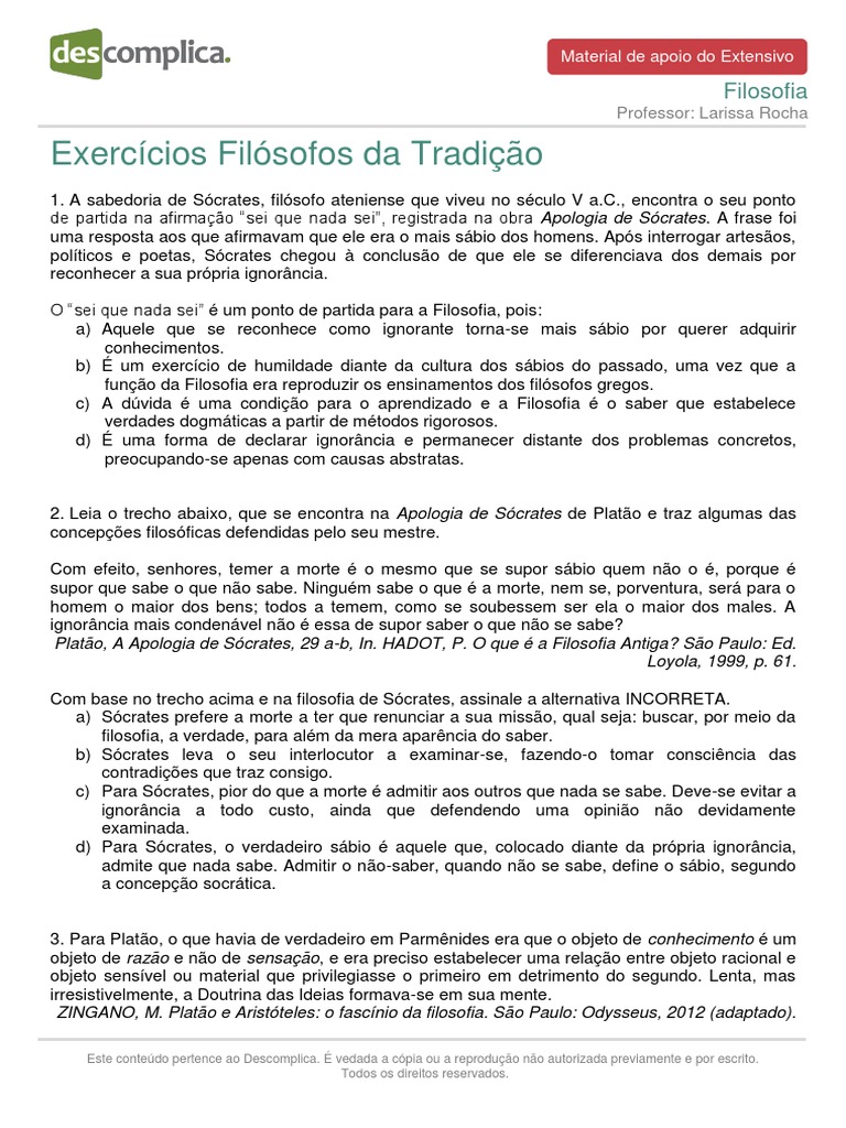 2. Leia o trecho abaixo, que se encontra na Apologia de Scrates de Plato e traz algumas das