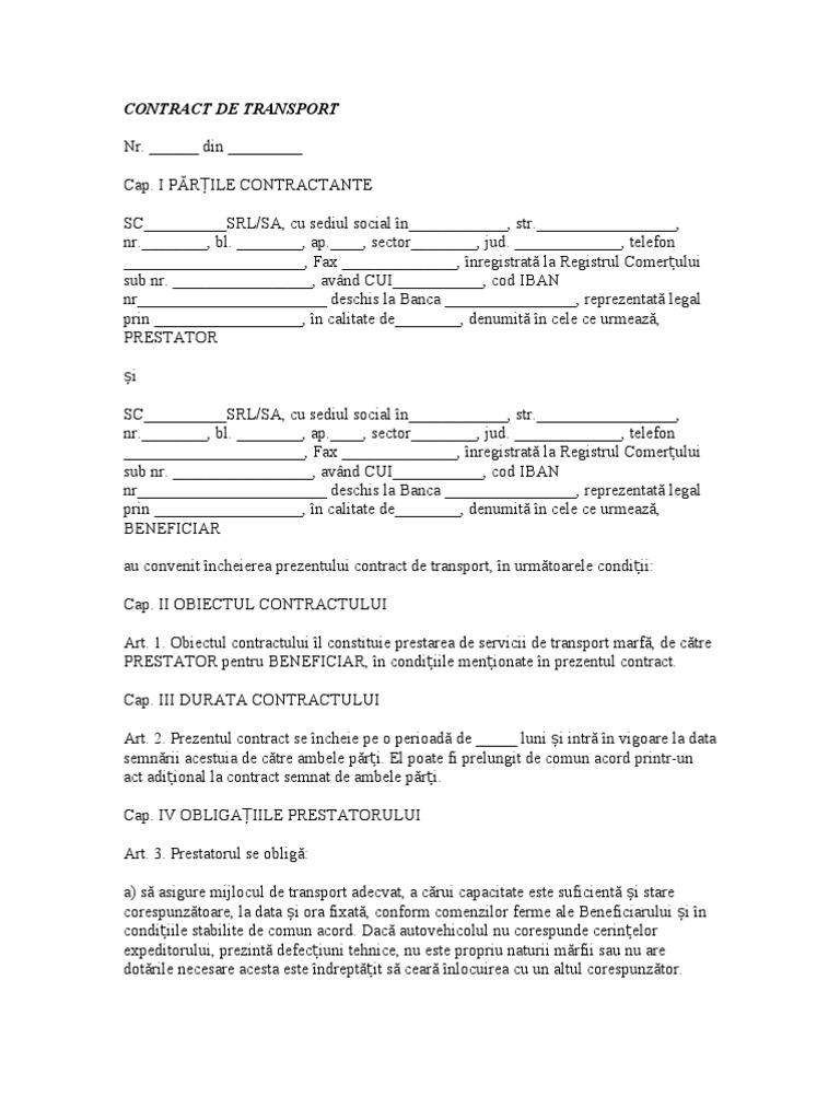 Art. 1. Obiectul contractului îl constituie prestarea de servicii de transport marfă, de către