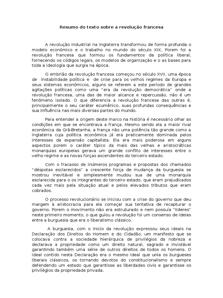 modelo econmico e o trabalho no mundo do sculo XIX, Porem foi a revoluo francesa que formou os fundamentos da poltica liberal, fornecendo os cdigos legais, os modelos de organizao e o as bases para toda a ideologia que surgia na poca. O embrio da revoluo francesa comeou no sculo XVII, uma poca de instabilidade poltica e de crise para os velhos regimes da Europa e seus sistemas econmicos, alguns se referem a este perodo de grandes agitaes polticas como uma era da revoluo democrtica onde a revoluo francesa, uma das de maior alcance e repercusso, no um fenmeno isolado. O que diferencia a revoluo francesa das outras , principalmente o seu carter ecumnico, suas profundas consequncias e sua influncia nas mais diversas partes do mundo. Para entender a origem deste marco na histria necessrio olhar as condies em que se encontrava a frana. Mesmo sendo ela a maior rival econmica da Gr-Bretanha, a frana no uma potncia to grande como a Inglaterra cuja poltica econmica j era praticamente dominada pelos interesses da expanso capitalista. Ela era mais poderosa em alguns aspectos porem o carter tpico da mais das velhas e aristocrticas monarquias europeias gerava um grande conflito de interesses entre o velho regime e as novas foras ascendentes do terceiro estado. Com o fracasso de inmeros programas e propostas dos chamados dspotas esclarecidos a crescente fora de mudana da burguesia se mostrou inevitvel e simplesmente mudou sua de uma monarquia esclarecida para o os integrantes do terceiro estado, que eram prejudicados cada vez mais pela situao atual e pelos elevados tributos que eram cobrados. O processo revolucionrio se iniciou com a crise do governo que deu margem aristocracia para ela comear sua tentativa de recapturar o governo. Porem o movimento no era estruturado e nem possua lideres neste primeiro momento, o que guiou a revoluo foi um consenso de ideias entre a burguesia que era o liberalismo clssico. A burguesia, com o inicio da revoluo expressou seus ideais na Declarao dos Direitos do Homem e do Cidado, um manifesto que se colocava contra a sociedade hierrquica de privilgios da nobreza e declarava a propriedade como um direito natural, sagrado e inviolvel garantindo tambm uma srie de outros direitos de todos os homens. O ideal contido nesta Declarao era o mesmo ideal que unia os burgueses liberais clssicos, os tornando devotos do constitucionalismo e sempre defendendo um estado que garantisse as liberdades civis e garantisse os privilgios da propriedade privada.