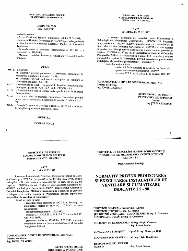 La cererea Institutului de Cercetari pentru Echipamente ~i Tehnologii de Mecanizarea Construcjiilor - ICECON SA Bucuresti, inregistrata cu nr. 2965107.11.1997, in conformitate cu prevederile art. 16 lit.e), alin. (3) din Ordonanta Guvernului nr. 60/1997 - privind apararea impotriva incendiilor ~i potrivit atributiilor ce Ii revin conform prevederilo~ Legii nr. 121/1996 art. 17 (1) lit. d), Inspectoratul General al Corpului Pompierilor Militari avizeaza regulile ~i masurile de prevenire ~i stingere a incendiilor cuprinse in "Normativul privind proiectarea §i executarea instalatillor de ventilare §i climatizare" - indicativ I 5.
