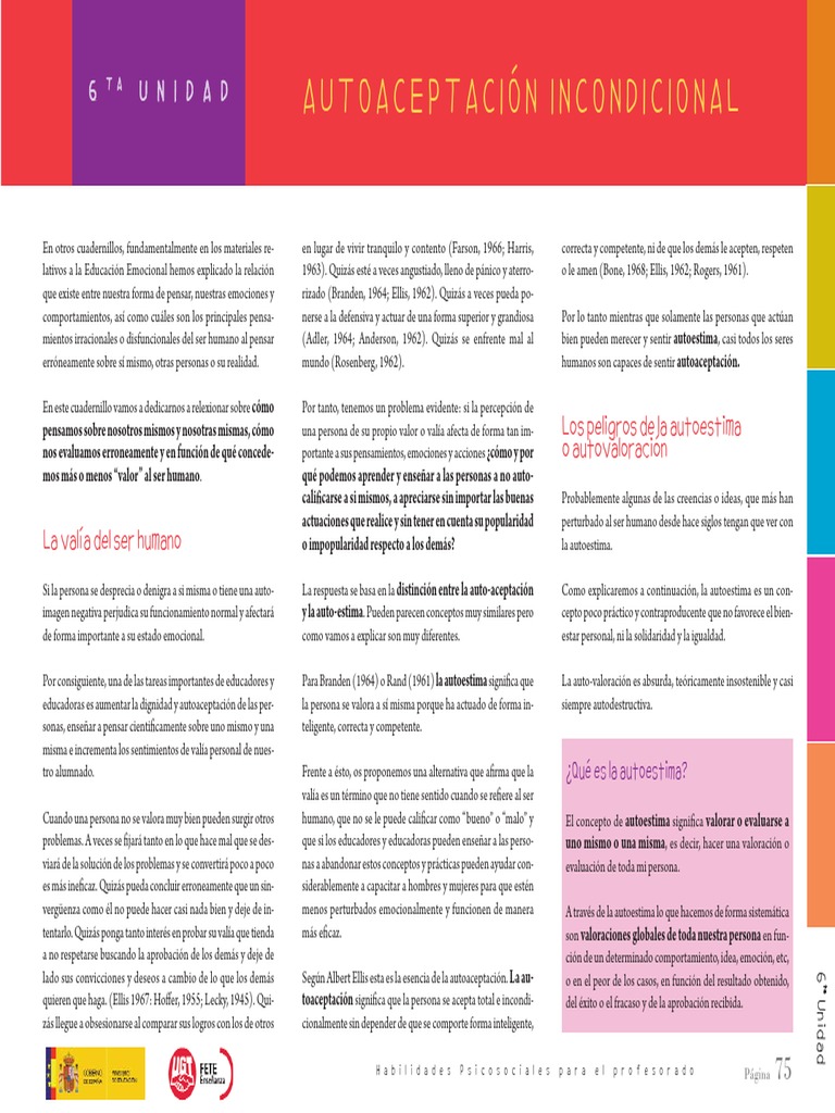 Segn Albert Ellis esta es la esencia de la autoaceptacin. La autoaceptacin significa que la persona se acepta total e incondicionalmente sin depender de que se comporte forma inteligente,