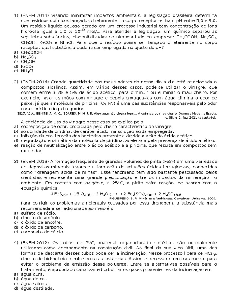 Para corrigir os problemas ambientais causados por essa drenagem, a substncia mais