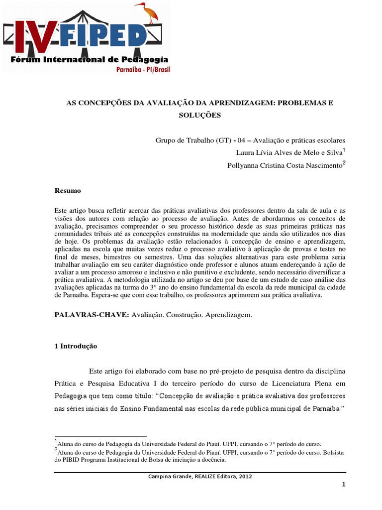 PALAVRAS-CHAVE: Avaliao. Construo. Aprendizagem.