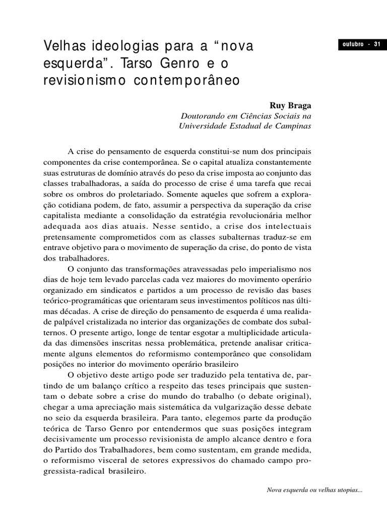 teórica de Tarso Genro por entendermos que suas posições integram decisivamente um processo revisionista de amplo alcance dentro e fora do Partido dos Trabalhadores, bem como sustentam, em grande medida, o reformismo visceral de setores expressivos do chamado campo pro- gressista-radical brasileiro.