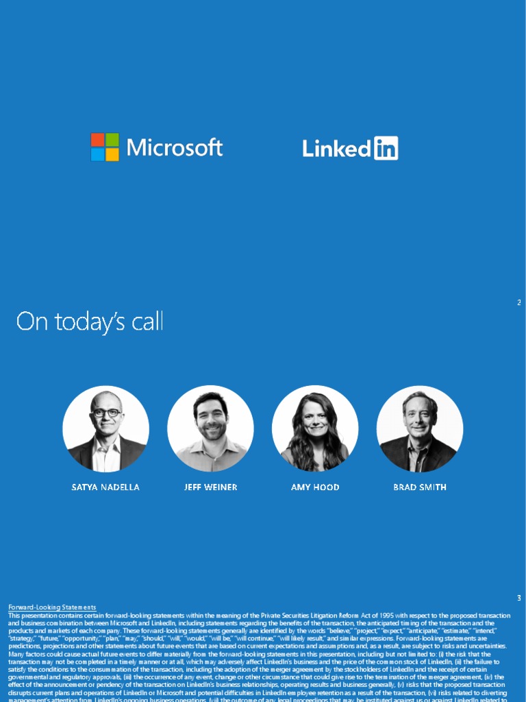 Forward-Looking Statements This presentation contains certain forward-looking statements within the meaning of the Private Securities Litigation Reform Act of 1995 with respect to the proposed transaction and business combination between Microsoft and LinkedIn, including statements regarding the benefits of the transaction, the anticipated timing of the transaction and the