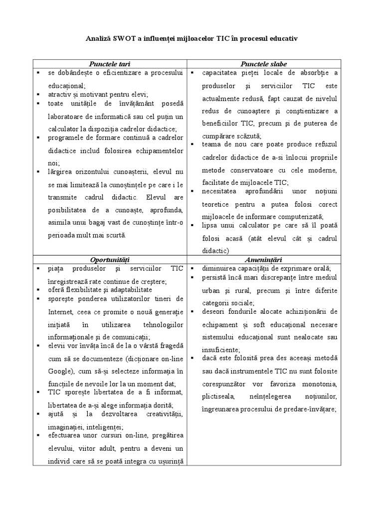 Analiz SWOT a influenei mijloacelor TIC n procesul educativ