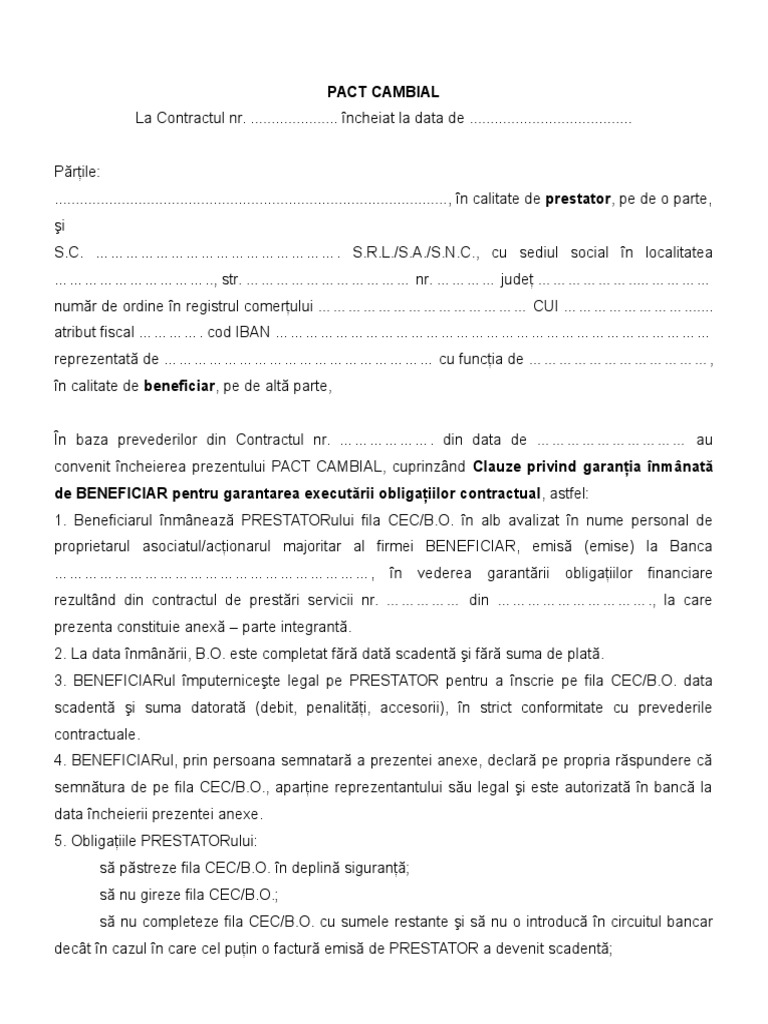 convenit ncheierea prezentului PACT CAMBIAL, cuprinznd Clauze privind garania nmnat