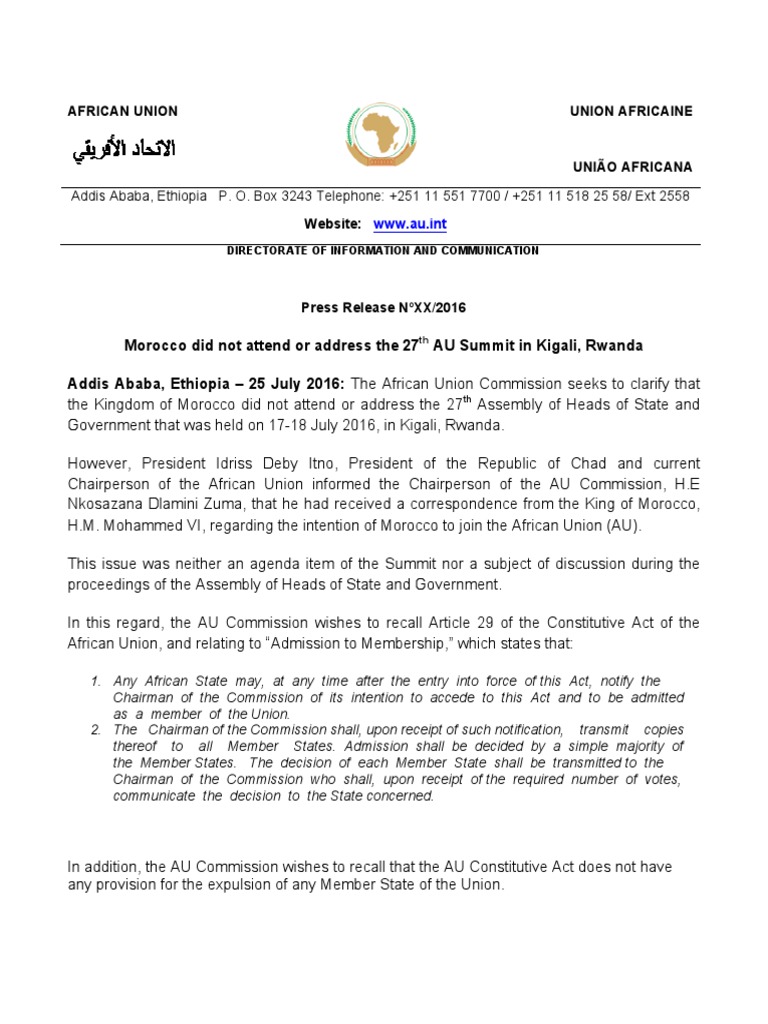 Addis Ababa, Ethiopia 25 July 2016: The African Union Commission seeks to clarify that