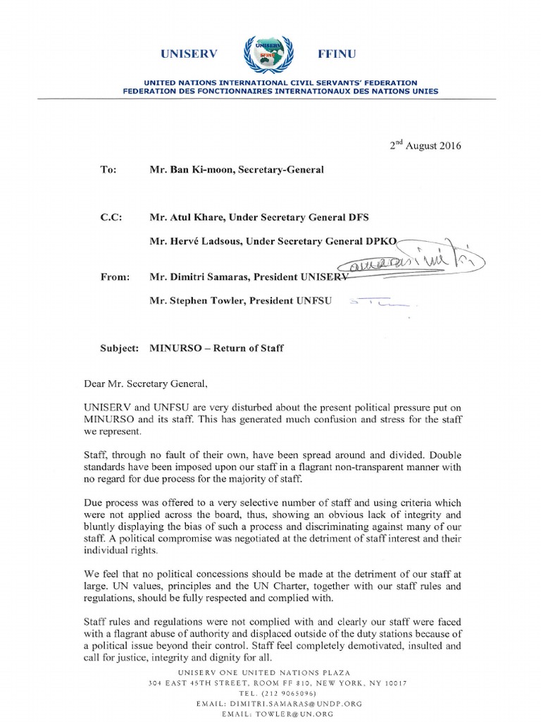 Now MINURSO staff through their unions have complained to UN Secretary General Ban Ki-moon and UN Peacekeeping chief Herve Ladsous, as well as Atul Khare, about political pressure being applied to them by the UN, about bias, discrimination and lack of due process. This has become a hallmark of Ban Ki-moon's UN.