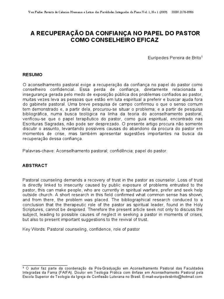 Conclui-se que resgatar a confiana no papel do pastor como conselheiro um