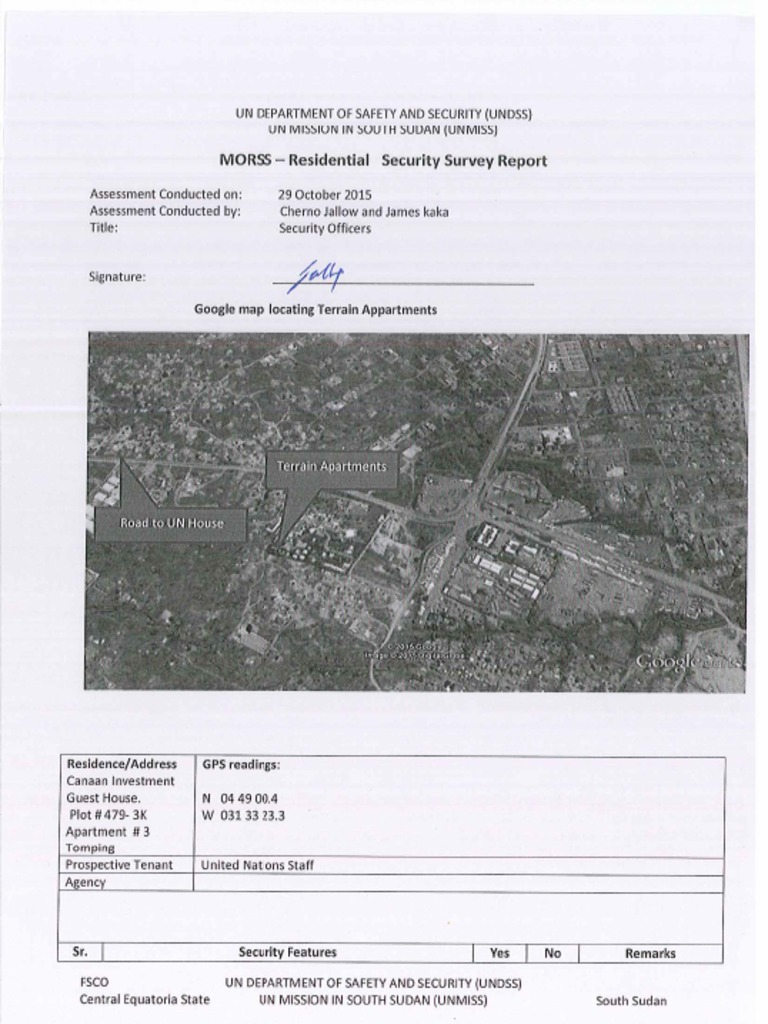 UNITED NATIONS, August 22 -- The UN judged the Terrain Apartments in Juba, South Sudan to be safe and well-protected in October 2015, documents obtained and exclusively published by Inner City Press show. In July 2016 the UN did nothing while those living there were rapes and, in the case of journalist John Gatluak, killed.