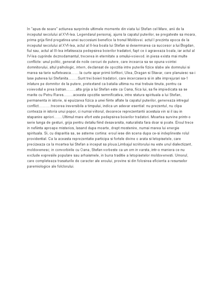 In "apus de soare" actiunea surprinde ultimele momente din viata lui Stefan cel Mare, anii de la