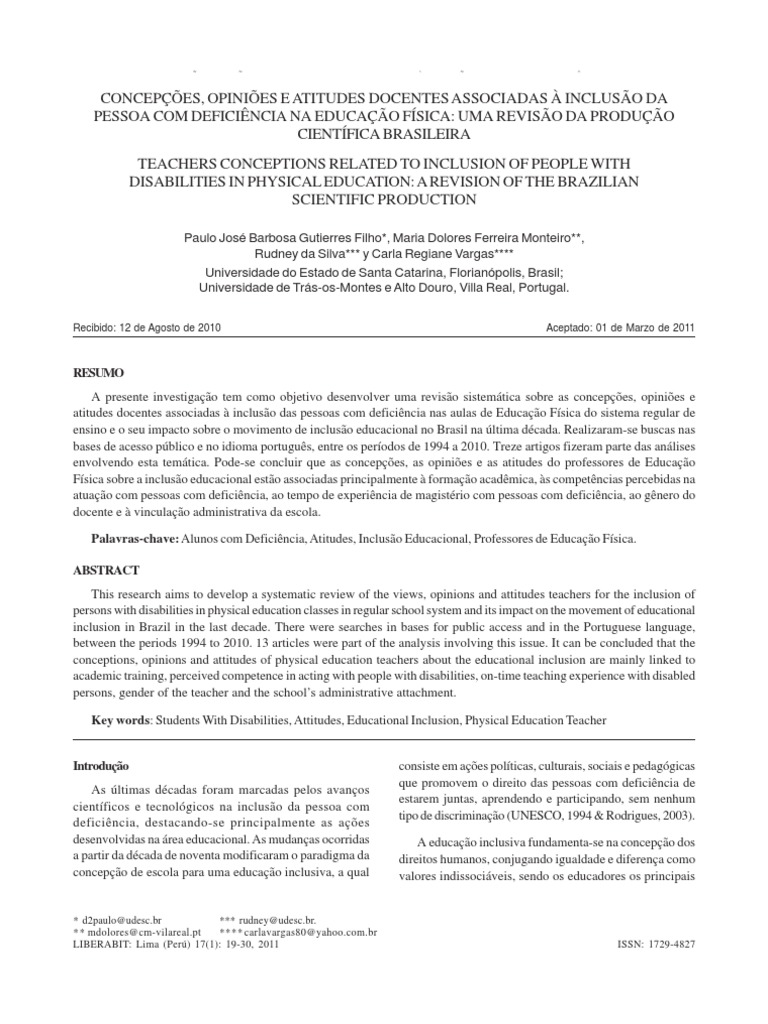 Palavras-chave: Alunos com Deficiência, Atitudes, Inclusão Educacional, Professores de Educação Física.