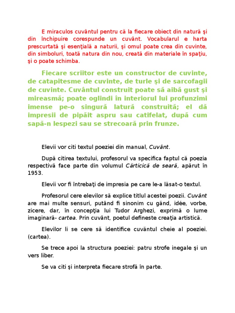 Elevii vor citi textul poeziei din manual, Cuvnt.