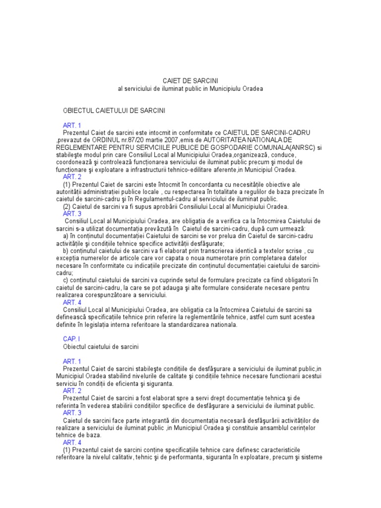 Prezentul Caiet de sarcini stabilete condiiile de desfurare a serviciului de iluminat public,in